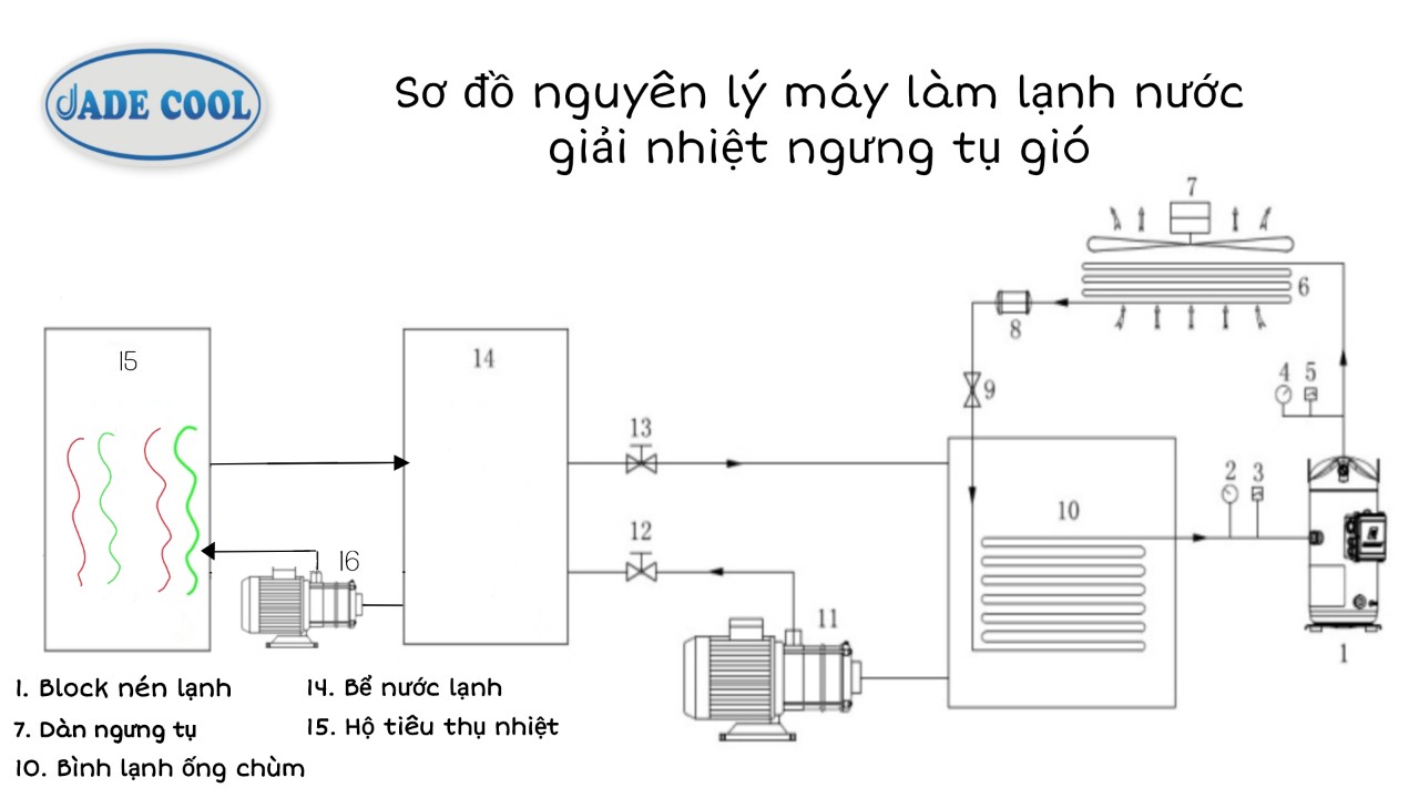 - Sau khi đã kết nối máy chiller với nguồn điện, nguồn nước phù hợp: Máy nén chiller hoạt động làm lạnh nước xuống nhiệt độ cài đặt, nước từ trong taxk được bơm đi đến các thiết bị cần trao đổi nhiệt sau khi nước lạnh hấp thụ nhiệt nóng và tăng nhiệt độ sẽ được hồi quay trở lại bể để làm lạnh rồi lại tiếp tục được bơm vào tạo thành một vòng tuần hoàn kín duy trì liên tục. Nhiệt độ nước bơm vào sẽ chênh lệch so với nước sau khi trao đổi nhiệt quay ra từ 5-7 độ C.